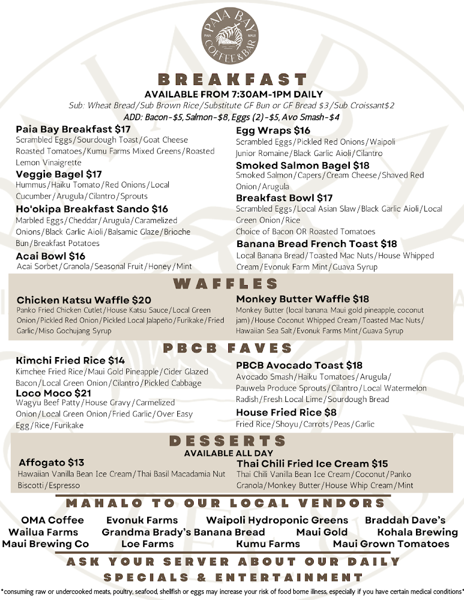 Welcome to Paia Bay Coffee & Bar, a gem nestled in the heart of Paia, Hawaii. Renowned for its vibrant all-day breakfast offerings, this café is an ideal stop for both locals and travelers alike. The menu features a delightful selection, including the Paia Bay Breakfast with scrambled eggs, goat cheese, and roasted tomatoes, or opt for the indulgent Chicken & Waffles, expertly complemented with house-made katsu sauce and gochujang miso syrup.