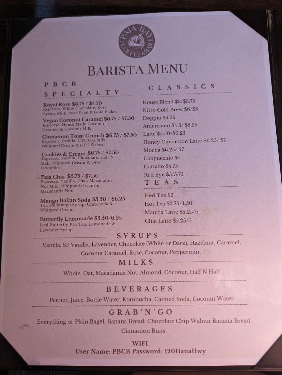 Guests rave about the relaxed atmosphere and attentive service, making it a perfect pit stop, whether you're fueling up for the Road to Hana or unwinding with a refreshing drink. The signature rose latte is a must-try, beautifully garnished with dried rose petals. Paia Bay is not just about coffee; it’s where flavors meet island vibes, creating an unforgettable dining experience.